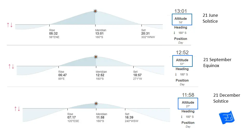 This information is useful when you need to calculate roof overhangs, or the angle of louvres to shade from the sun.